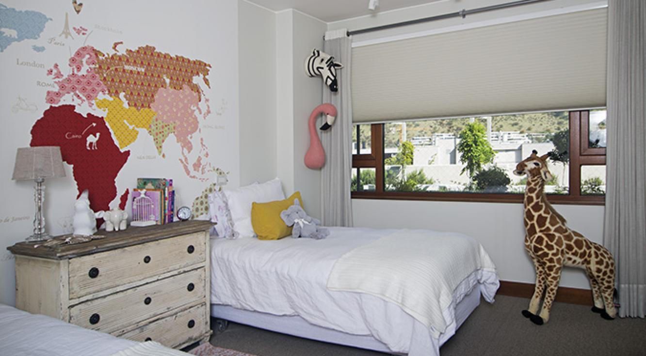 "En esta habitación de niñas quisimos buscar un diseño que diera la sensación de frescura y calidez. Utilizamos tonos claros y elementos en madera. Era necesario lograr un completo black out que favoreciera el descanso de las niñas; instalamos la cortina Duette® que, además de armonizar el espacio, ayuda a mantener la temperatura del ambiente".