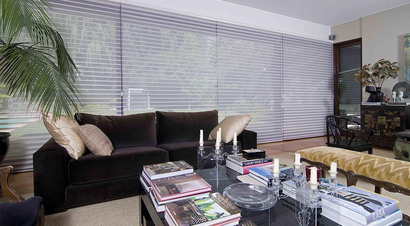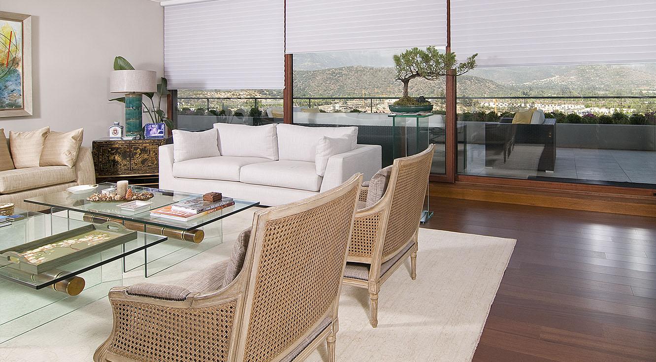 El punto focal de esta sala de estar era la magnífica vista exterior. Por tal razón, era evidente que las cortinas iban a tener un papel protagónico. El producto escogido fue la Cortina Silhouette®, que garantiza un gran manejo de la iluminación. Gracias a su gramaje, logramos separar el ambiente interior de la sala del balcón exterior, y generar, así mismo, un espacio con mayor privacidad para sus habitantes.