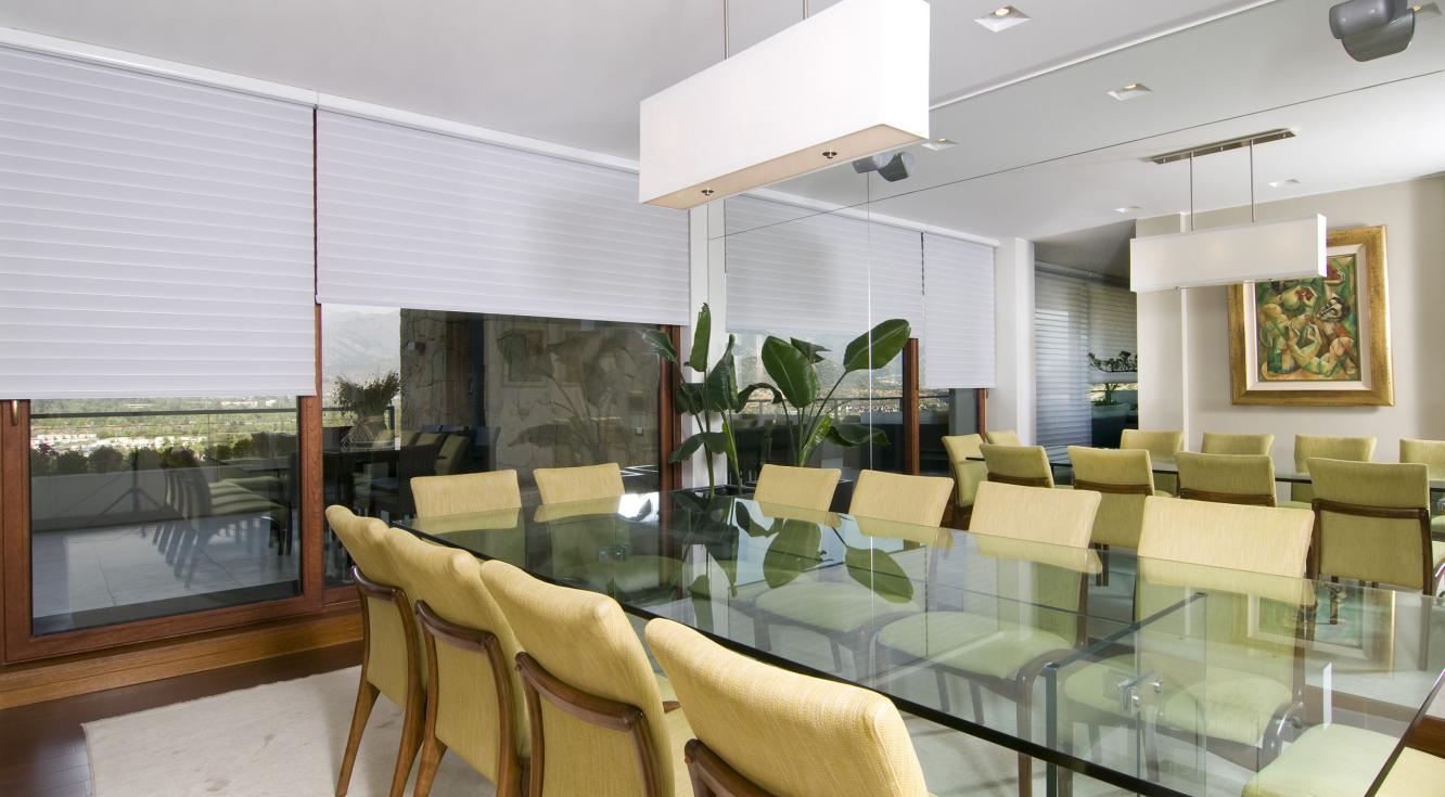 El área del comedor de este apartamento dúplex fue elegantemente decorada con tonos naturales, con paredes y cielos en color blanco para favorecer la luminosidad que requería el ambiente. El producto que seleccionamos fueron las cortinas Silhouette®, ideales porque combinan con el blanco del espacio y aportan a la decoración y a la funcionalidad del ambiente.